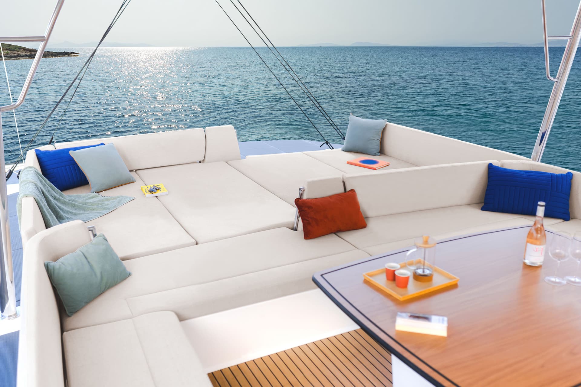 One of BALI’s signature moves is the conversion of what used to be a wide net (or trampoline) across the bows into a usable solid foredeck lounge or forward cockpit. This reimagining has multiple implications: