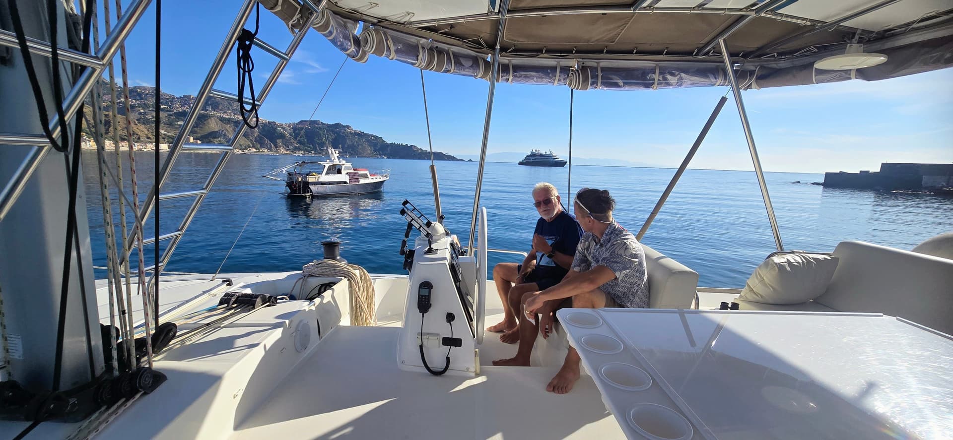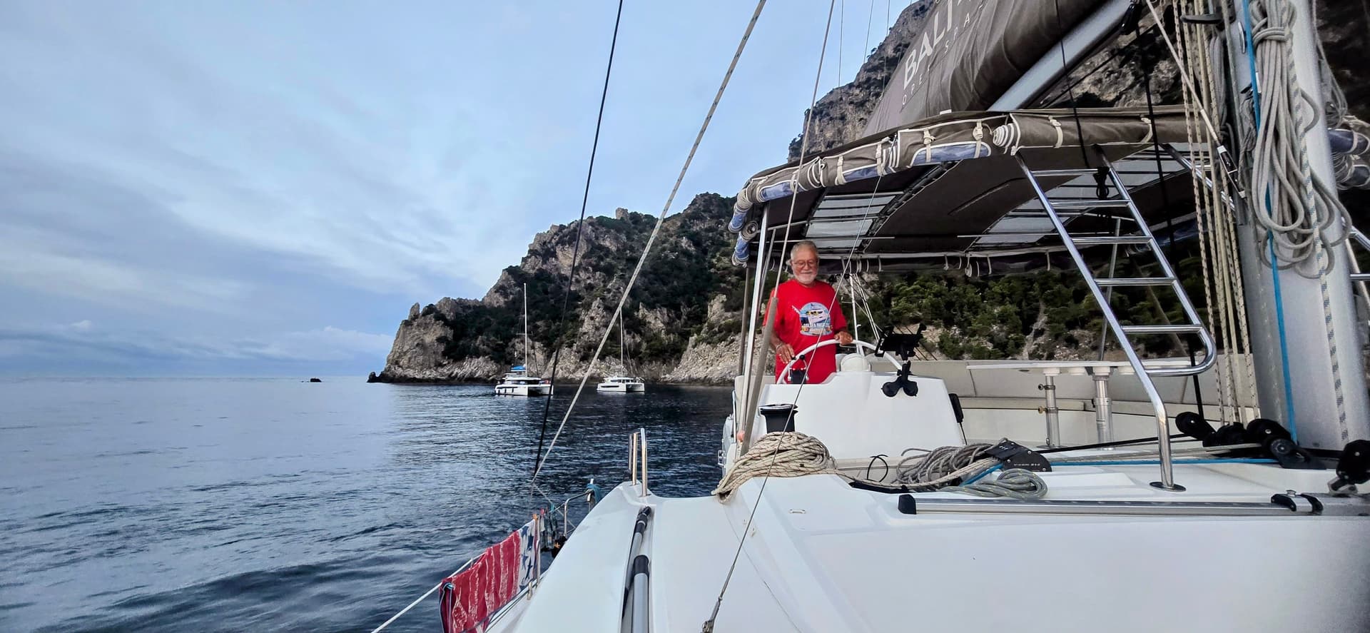 Life on board settled in naturally, as it does every year. The generous space of the boat, the light flooding through the saloon, and the open kitchen facing the horizon invite us to embrace the gentle rhythm of the sea. Under sail, the catamaran remains lively and stable, gliding gracefully across the water.