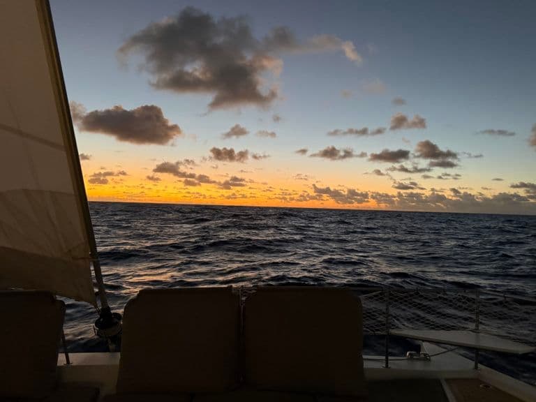 "First wake-up at sea for the whole family on this Transat’espoir. And if you’re wondering about the state of our stomachs… we’ll spare you the details! But yes, seasickness is real with the swell that has followed us since leaving Las Palmas. While Michèle holds strong, Roger seems to be the only one completely unaffected—even experienced sailors can suffer during the first days offshore. Let’s move on so I can finish writing this…